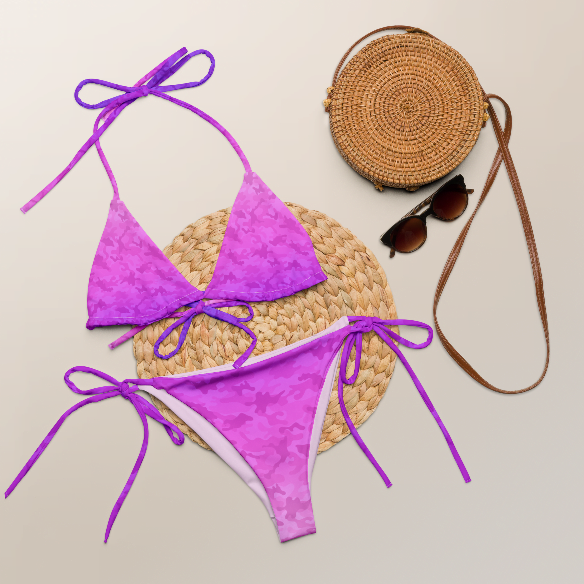 Introducing the TAO Blush & Stormy Camo String Bikini, where comfort meets style for an unforgettable summer experience. Designed with your needs in mind, this All-Over Print Recycled String Bikini set will keep you looking and feeling fabulous all season long.