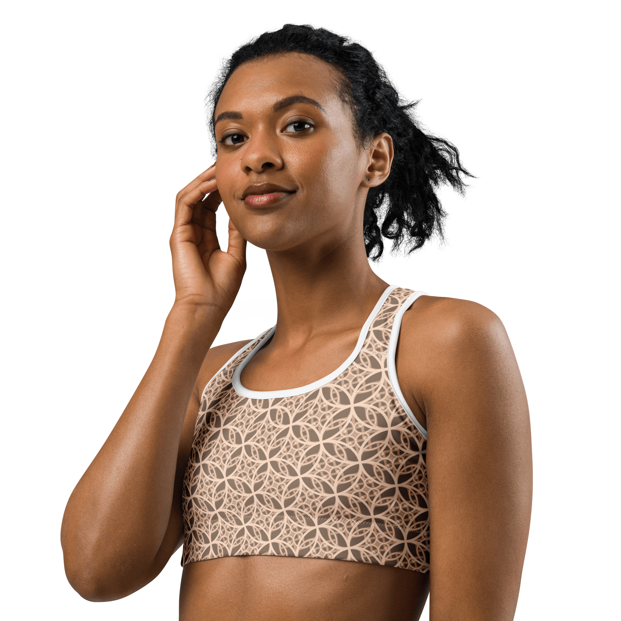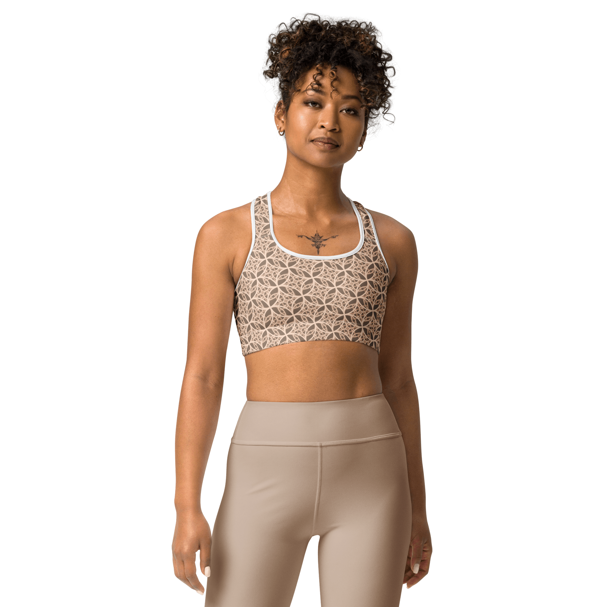 The Fibbo Beige Sports Bra is not just functional—it’s thoughtfully designed with details that enhance your experience. Flat seams and bias binding reduce friction, while the scoop neckline and racerback style offer timeless appeal. Inspired by the Fibonacci sequence, this bra seamlessly combines beauty and purpose.