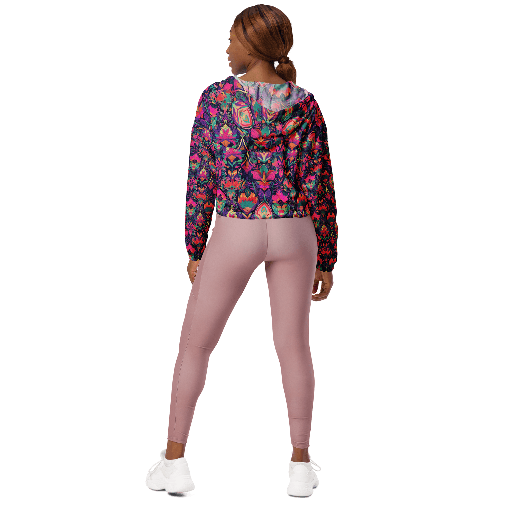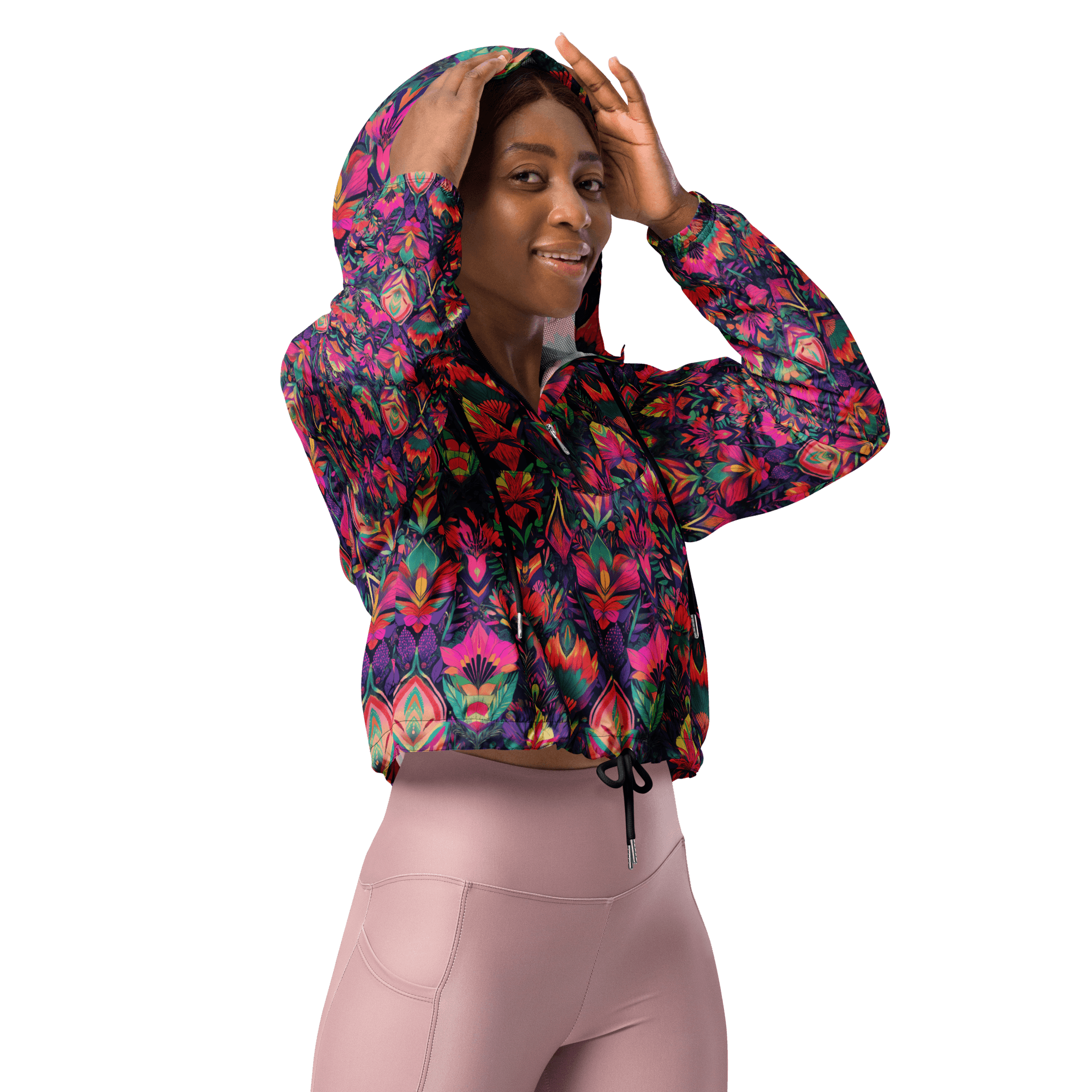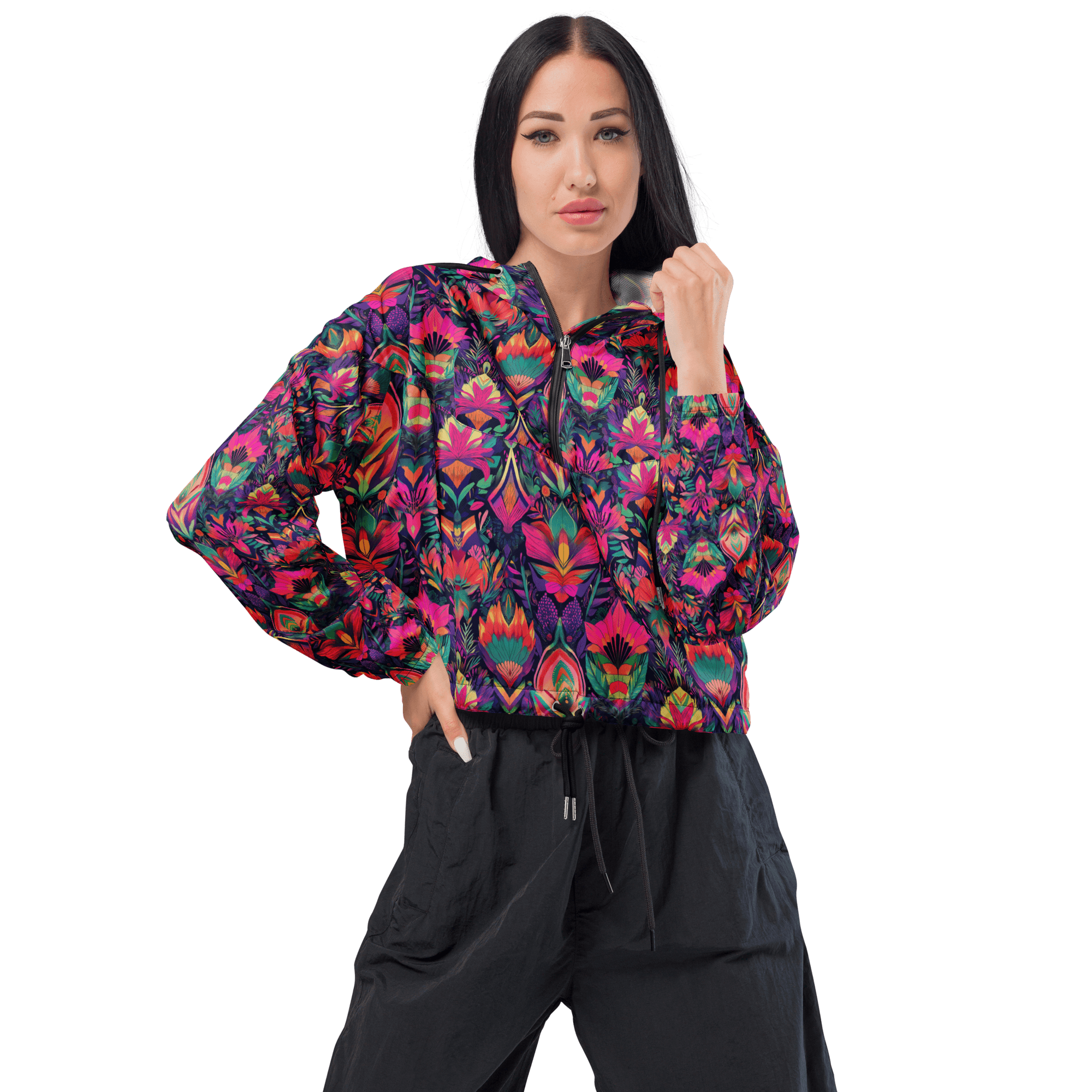 Step out in style with the Jungle Jam Windbreaker, designed to blend elegance with functionality. 🌧️✨ Adorned with a striking black and magenta floral pattern, this lightweight cropped windbreaker is perfect for hiking, jogging, or simply elevating your casual outdoor look.