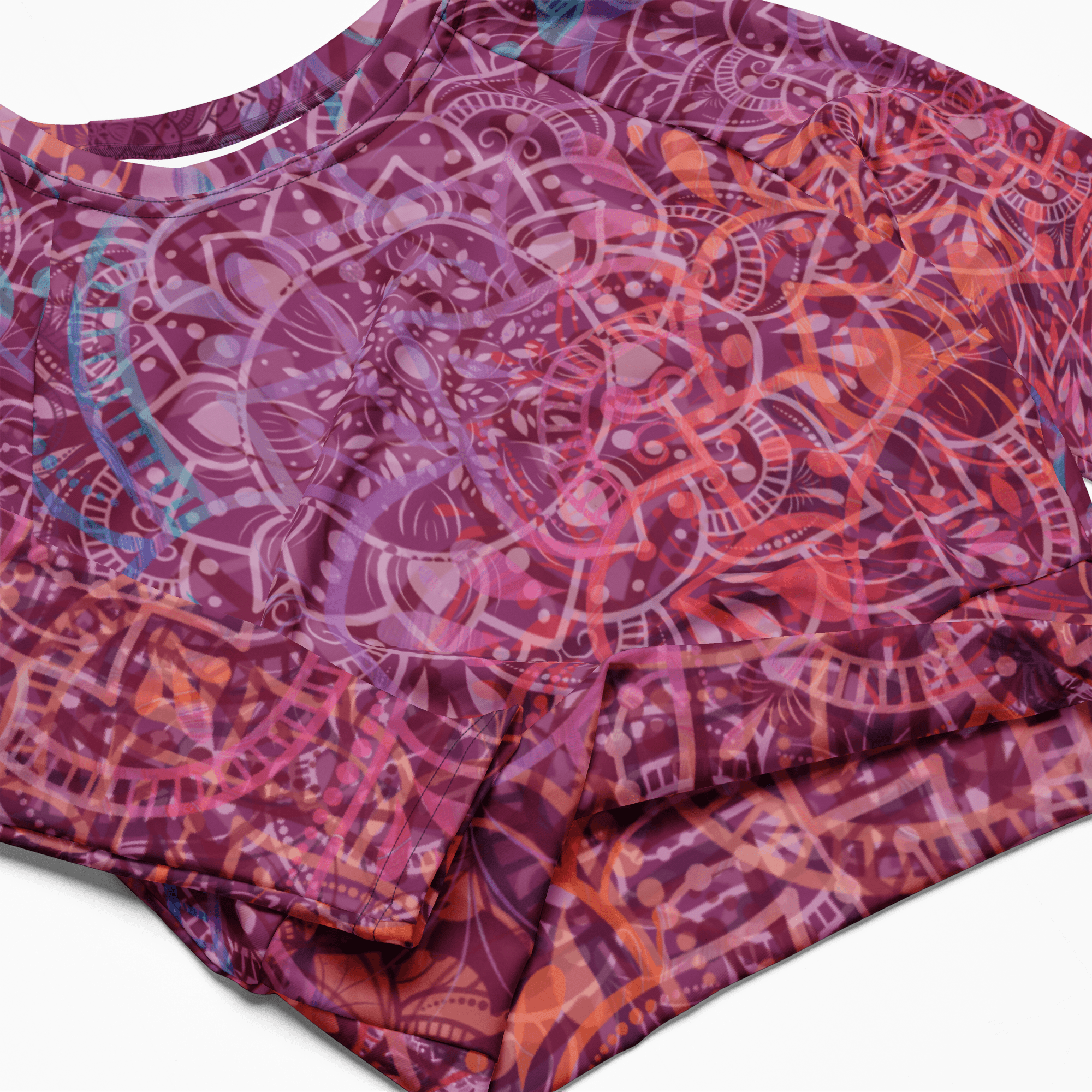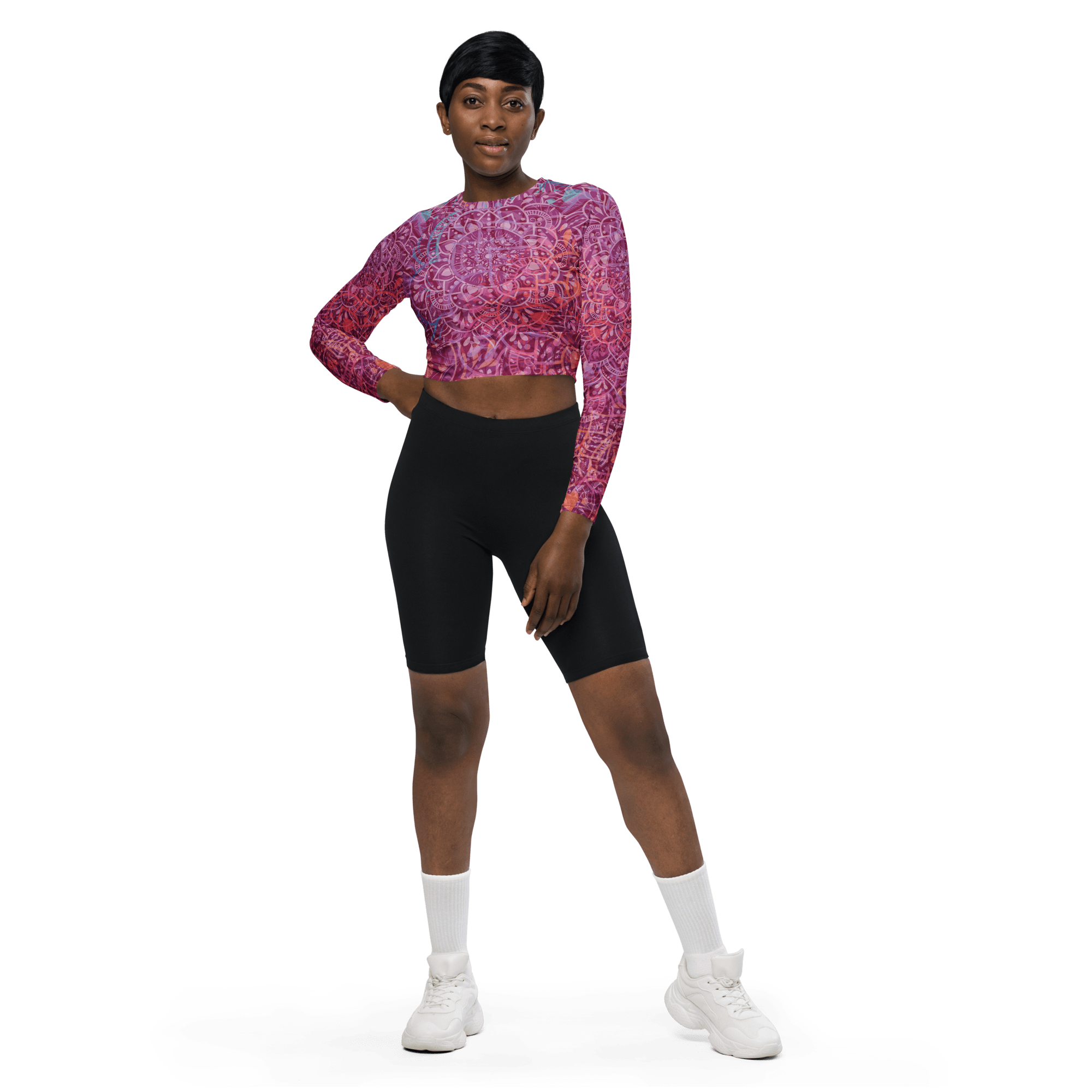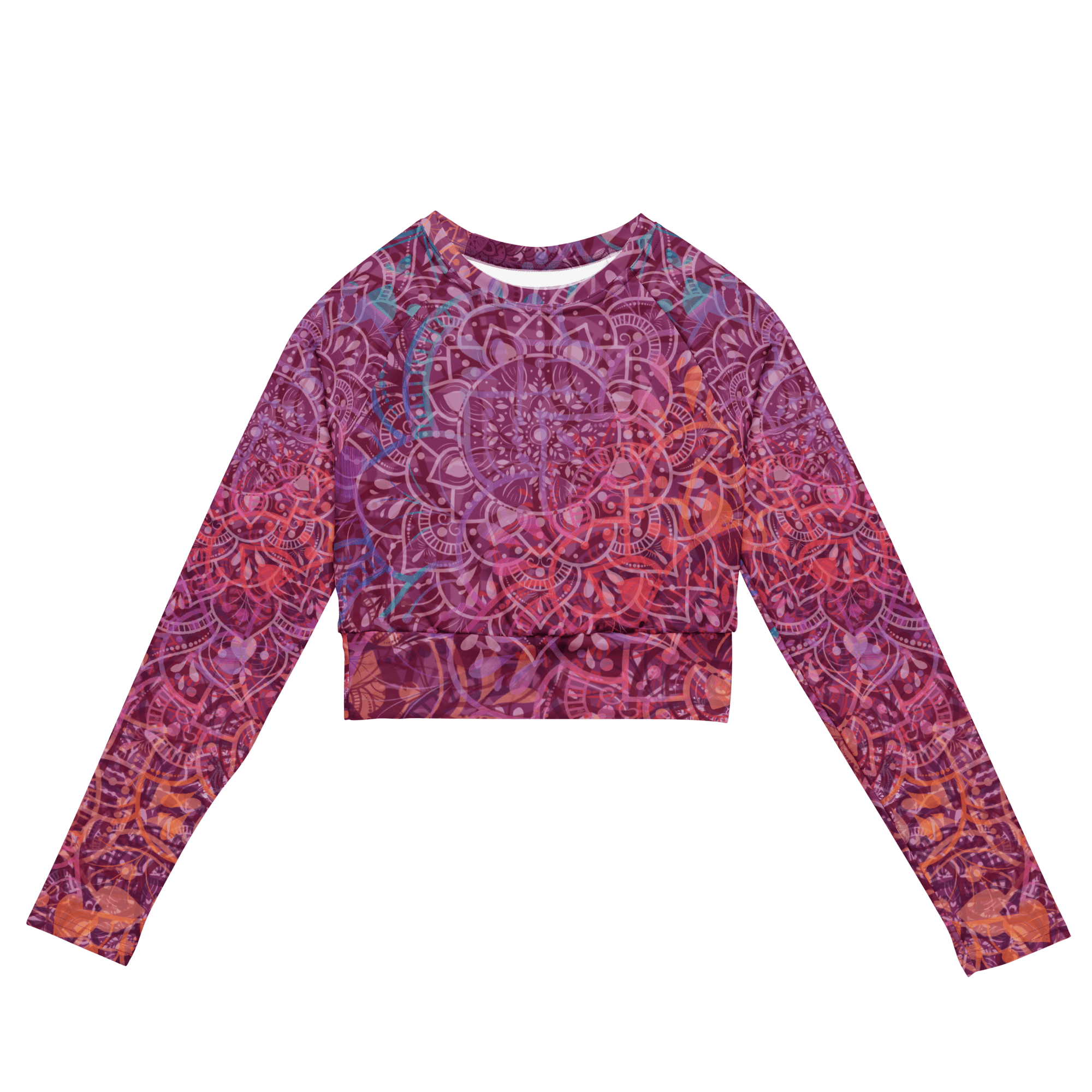 ✨ The Mandala Glow Long-Sleeve Crop Top combines style, comfort, and sustainability. Perfect for swimming 🏊‍♀️, workouts 🏋️‍♀️, or casual wear, this top is crafted with recycled materials, making it a 🌍 planet-friendly choice.